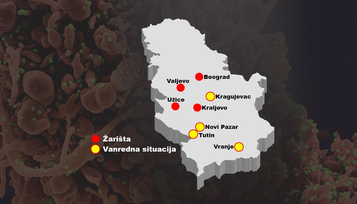 Gradovi u srbiji vanredno stanje. U mačvanskom okrugu situacija je zabrinjavajuća ocenili su u šabačkom zavodu za javno zdravlje a u vladimircima je uvedeno vanredno stanje objavljeno je na opštinskom sajtu. Sada u srbiji imamo 1 187 aktivnih slučajeva a ukupno registrovanih od počekta epidemije je 13 792. Na respiratoru su sada 32 pacijenta. U prethodna 24 časa u opštoj bolnici u novom pazaru preminule su dve osobe primljeno je 13 novih pacijenata pa je tako sada u regionalnoj bolnici koja od juče zbrinjava i pacijente iz sjenice i tutina ukupno 209 hospitalizovanih.